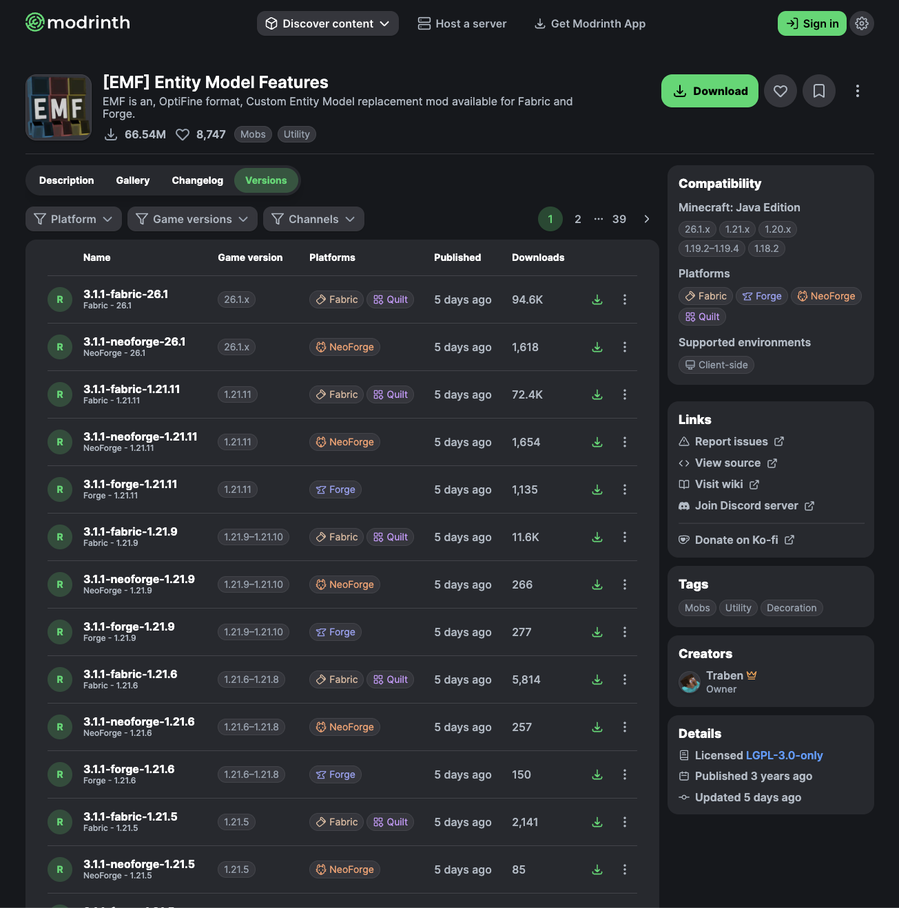 공식 페이지: Modrinth — [EMF] Entity Model Features