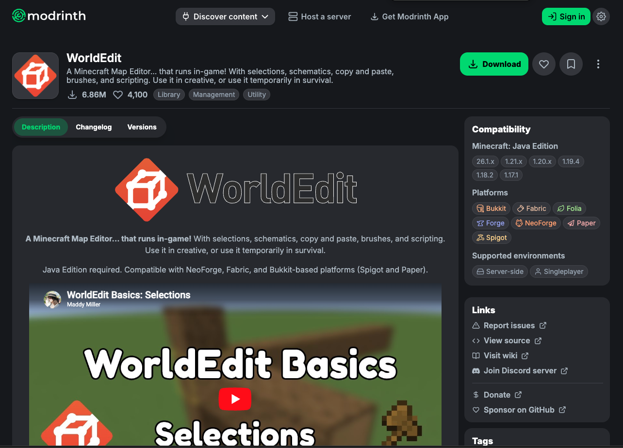 - WorldEdit 플러그인 파일: WorldEdit은 CurseForge 또는 Modrinth에서 최신 버전(서버 버전에 맞는)을 다운로드할 수 있습니다.